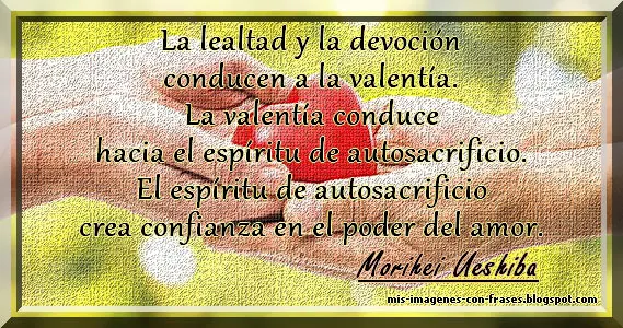 Frase: La lealtad y la devoción conducen a la valentía. La valentía conduce hacia el espíritu de autosacrificio. El espíritu de autosacrificio crea confianza en el poder del amor. Morihei Ueshiba